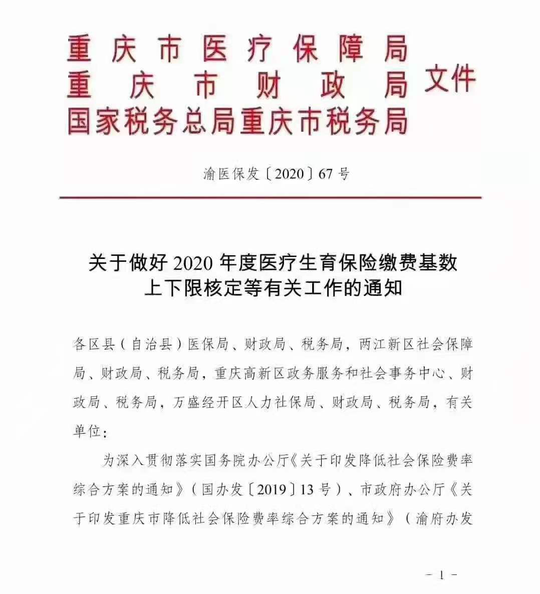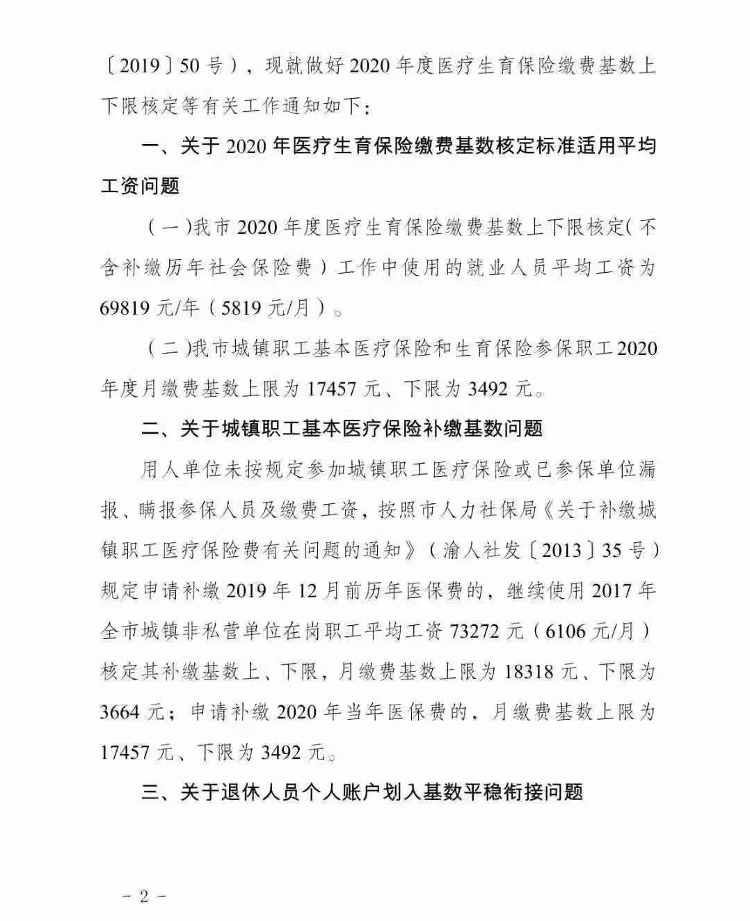 重慶醫(yī)療保障局、重慶市財(cái)政局以及國(guó)家稅務(wù)總局重慶市稅務(wù)局已明確指出關(guān)于重慶市2020年度醫(yī)療生育保險(xiǎn)繳費(fèi)基數(shù)核定標(biāo)準(zhǔn)適用平均工資問(wèn)題,我市城鎮(zhèn)職工2020年度月社平繳費(fèi)基數(shù)上限為17457元,下限為3492元。